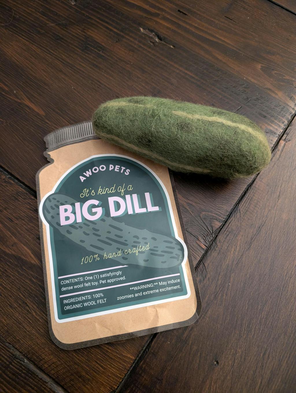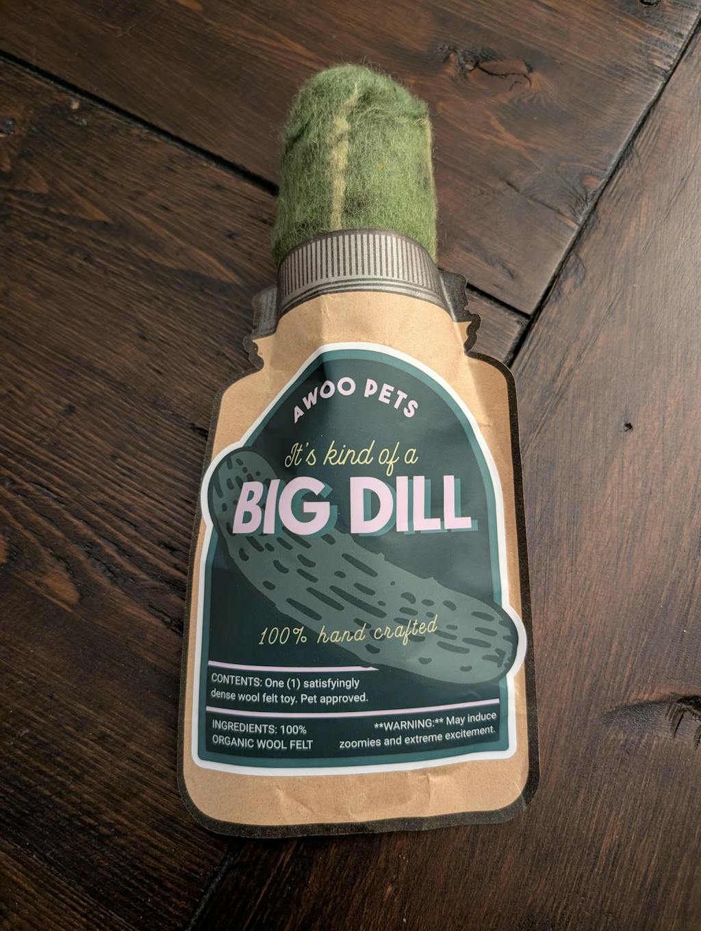 I surprisingly won the 'BIG Dill' felt toy and at first thought it funny. But my dog loves it. After seeing it and seeing how much he enjoys it, I've come to realize it makes for a really cute fun toy, and would make a great gift for any dog lover. The packaging is adorable, silly and fun.