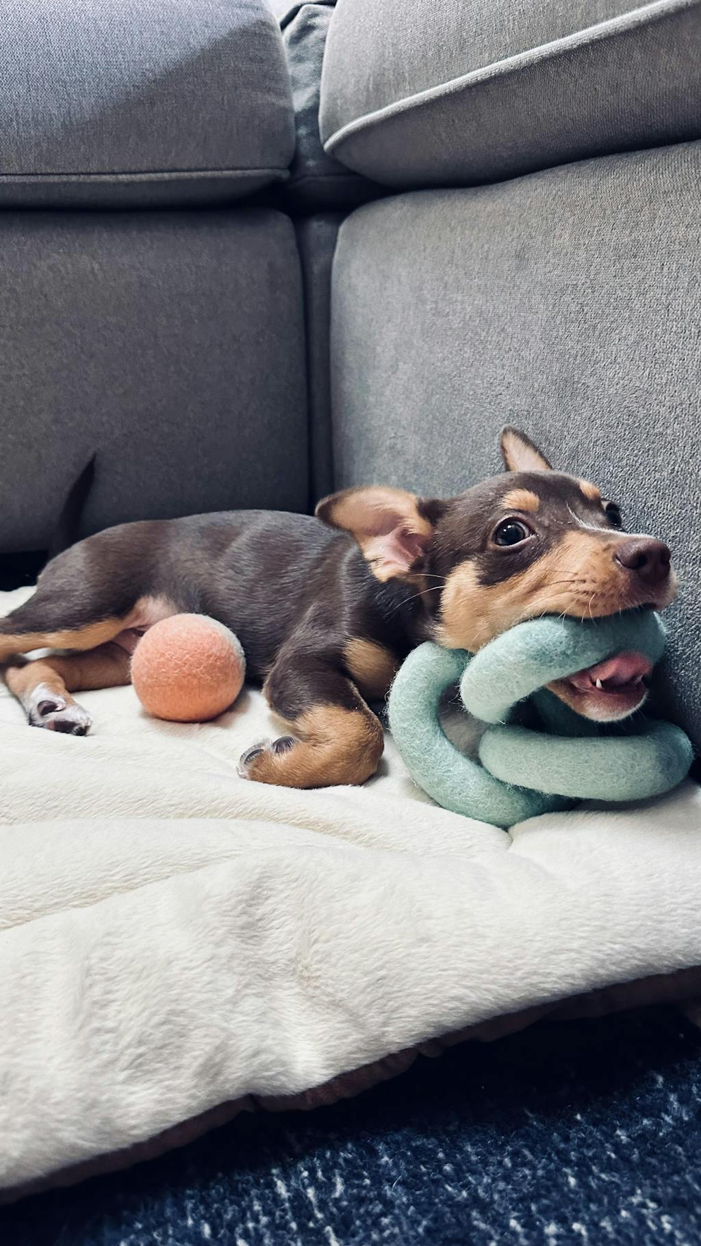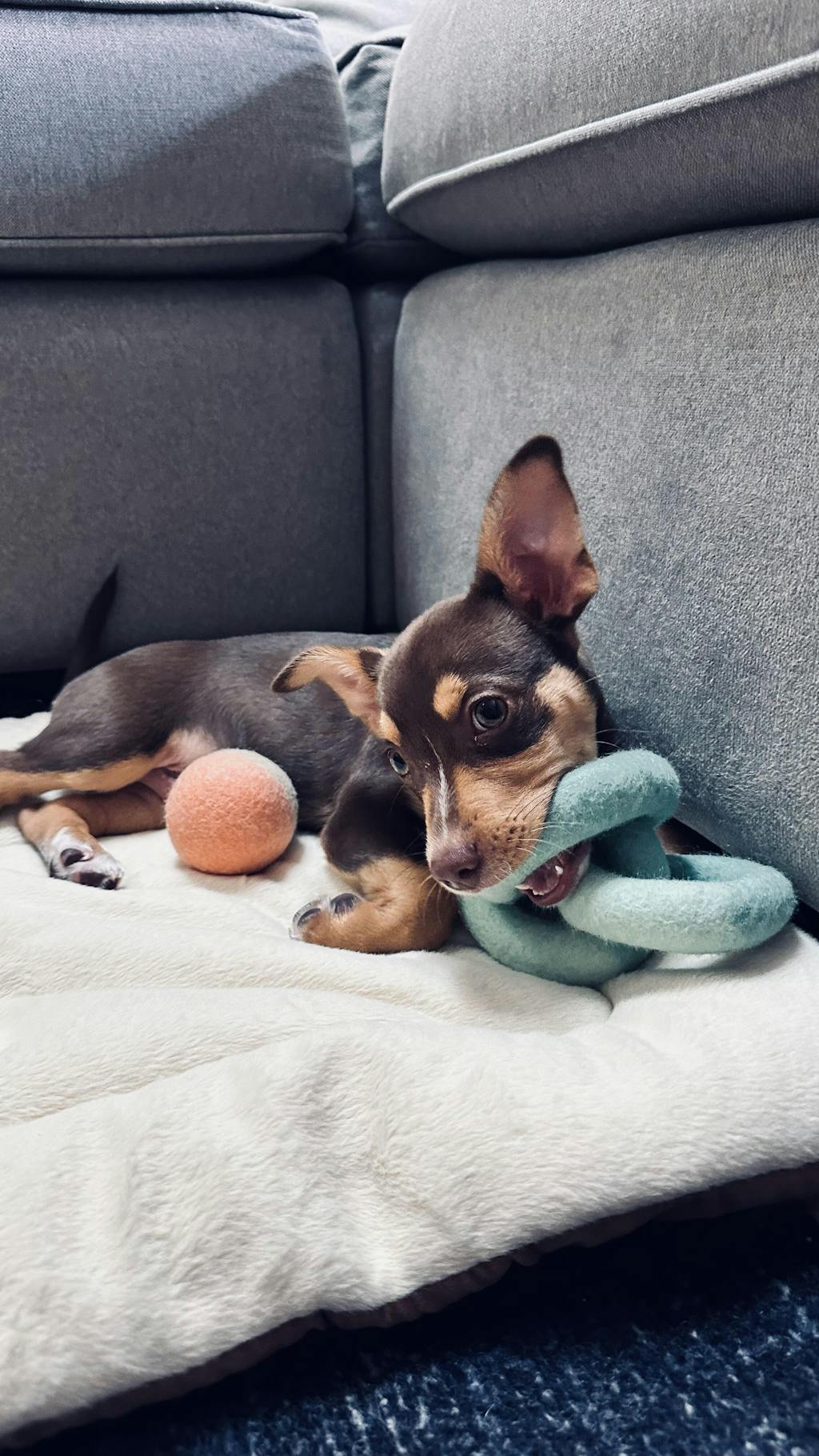 Each set has 3 colorful balls, available in 2 sizes. Size small is comparable to a tennis ball. Large size is recommended for larger breeds.